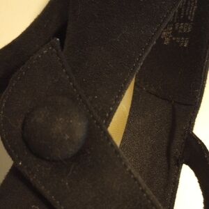American Eagle black velvet high heels in size 10 wide for women. These heels feature an almond toe shape, a buckle closure, and a mid-height block heel. The style is a classic pump design, perfect for adding a touch of sophistication to any outfit.