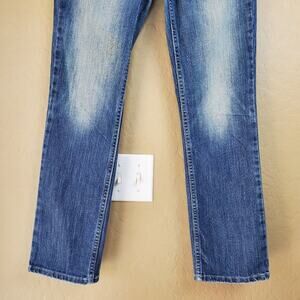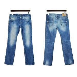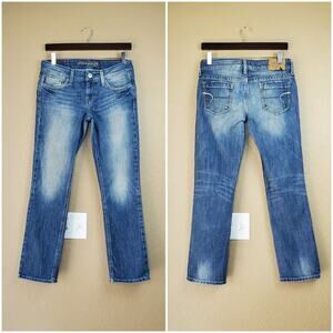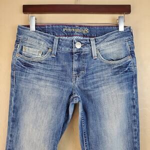 American Eagle Outfitters (AEO) vintage hipster denim jeans, size 4. Straight leg. Low rise. Pants zip and have a button closure.