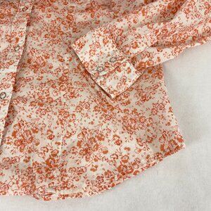 American Eagle Outfitters Floral Western Style Snap Button Top. 100% cotton with white background and all-over, small print floral in coral. Front and back yokes with piped trims. Chest pockets with snap closures. Slim fit. Snap button closures.