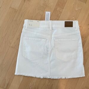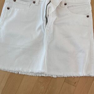 Stylish white denim skirt. Features classic five-pocket design. Frayed hem for a trendy look.