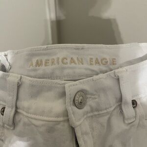 Stylish white jean shorts. Distressed design. High-waisted fit. Perfect for casual wear. Has a bleach spot as pictured