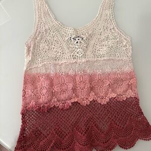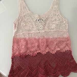 This stylish tank top from American Eagle Outfitters features a unique asymmetrical design with a cropped fit. The top showcases a beautiful ombre effect transitioning from white to pink, adding a touch of elegance to its lightweight and airy construction.