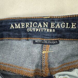 These American Eagle Outfitters women's dark wash denim shorts feature a comfortable fit with "Next Level Stretch" fabric. The midi design offers a stylish cuffed hem and a medium rise for effortless casual wear. Made with a durable cotton blend, they ensure lasting quality.