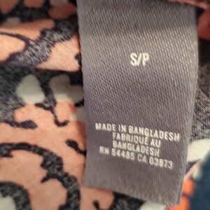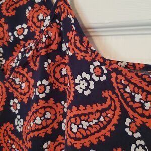 Navy with orange and white floral Paisley pattern. V neck, spaghetti straps, wider are holes, cropped.