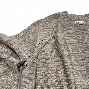 Soft taupe cardigan with open front. Features ribbed cuffs and hem. Ideal for layering.