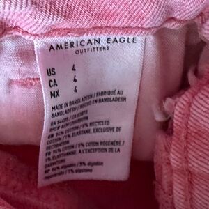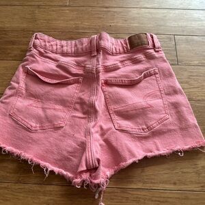 These pink jean shorts from American Eagle Outfitters feature a stylish frayed hem and a relaxed, cut-off design. The soft denim material and faded color offer a vintage, summer-ready look.