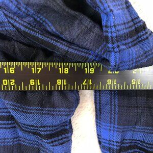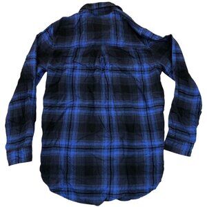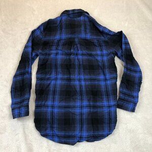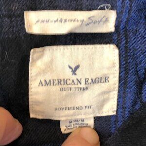 This American Eagle Outfitters plaid shirt is crafted with a soft, lightweight fabric, offering a relaxed boyfriend fit. The classic blue and black checkered pattern exudes casual charm, making it a versatile wardrobe staple. With a collared neckline, button details, and a slightly curved hem, it blends comfort and style effortlessly.