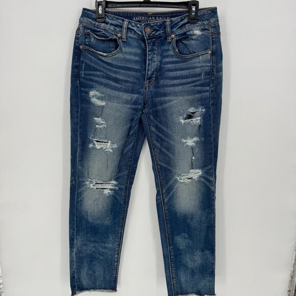 Keywords: AE jeans, distressed denim, ripped jeans, straight leg, cropped, button fly, stretch denim, casual, everyday, boyfriend jeans, mom jeans, streetwear