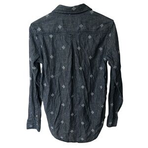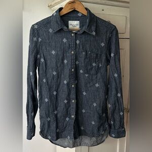 American Eagle Outfitters | Women’s blue chambray button down shirt. Long raw hems sleeveseves, single breast pocket, slightly rounded hem. Light blue embroidered diamond pattern. Machine wash cold, 100% cotton. Women’s size S