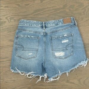 These jean shorts from American Eagle Outfitters showcase a trendy distressed design in a medium blue wash. The raw, frayed hem and intentional rips create a casual, worn-in look perfect for everyday wear. Ideal for adding a touch of edge to your summer wardrobe.