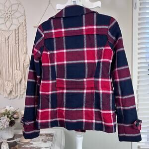 American Eagle Outfitters Wool Coat, sz Small. Excellent condition. Blue, white, and red vibrant plaid. Double breasted coat with a classic flap pocket on each hip. Two faux slant pockets at the breast. Adjustable wrist straps. Pit to pit width of this garment is 18 inches. Length from the top of the shoulder to the hem at the bottom is 25 inches. The sleeve length, measured from the center back straight across to the hem of the cuff is 33 inches. ALL MEASUREMENTS ARE APPROXIMATE.