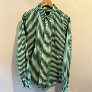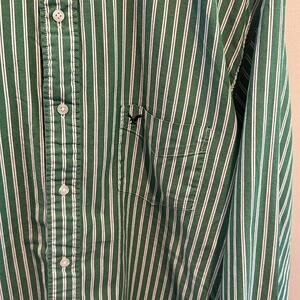 Excellent pre-owned condition, no flaws, American Eagle Outfitters long sleeve collared button down shirt. Men’s size X-large, shirt is vintage American Eagle from Y2K era. Shirt has hunter green base with white and black vertical stripes, classic look for work as business casual or a preppy, casual look.