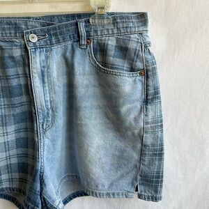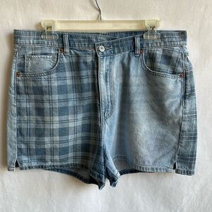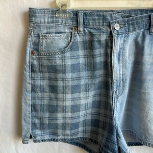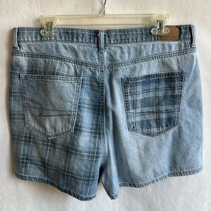 Adorable American Eagle Outfitters crossover high rise partial plaid blue denim shorts, size 14. Good preowned condition. Two-button crossover closure above zipper adds a cute detail. 5-pocket styling. 1.5” side slits.