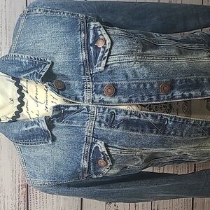 Fully button front with white was distressing. Long sleeves with button cuff and cropped waist. 100% cotton denim. Gently Pre-owned no damage.