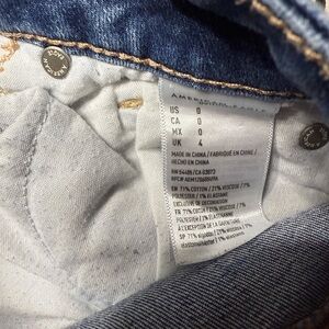 These blue jean shorts from American Eagle Outfitters showcase a stylish distressed design with a raw, frayed hem for a relaxed vibe. The medium-to-light wash and visible wear patterns add a touch of vintage charm, making them ideal for casual outings. Size 0. Smoke free home. Has holes and distressing