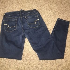 They are a faded blue pair of size 4 jeggings from American Eagle Outfitters. They have been worn many times but are in good condition.