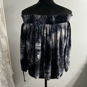 American Eagle Outfitters off the shoulder velvet top, size medium. Dark blue and white tie dye velvet in good condition. 90% polyester, 10% elastane