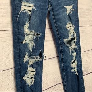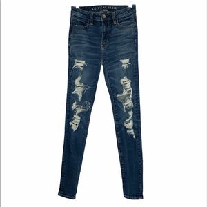 Mercian Eagle outfitters super high rise ripped jeggings. Size 0. Blue wash with rips. Comfortable and stretchy. One rip shows that it has ripped a little extra, this is shown in picture 4. Still cute hardly noticeable. Feel free to ask questions or bundle with other items for a great discount!