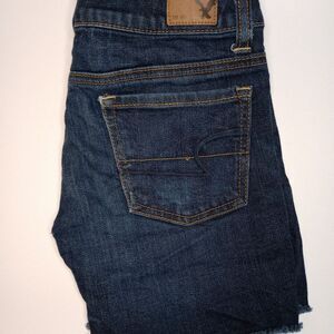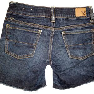 Decent condition size 0 American Eagle Outfitters stretch denim button up jean shorts. Missing one belt loop and has some roughed fabric shown in last three photos!