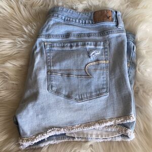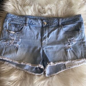 American Eagle 🦅 Outfitters Distressed Ripped Shortie Shorts. Size 33, please note: size tag has been removed, a stain, the ripping area is more pronounced and some pulling.