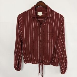 I'm great shape, no holes or stains. It ties in the front. Could fit as a size small. Burgundy and white stripes.