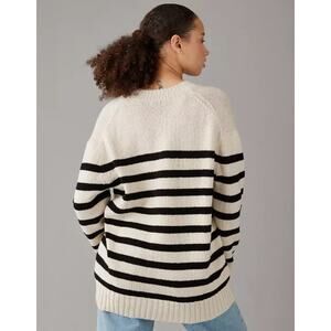 American Eagle Oversized Button-Front Long-Length Cardigan in Black & Cream Stripe.