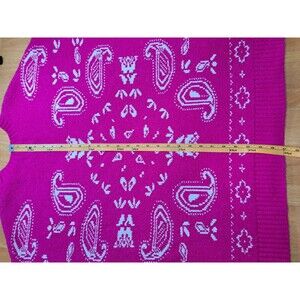 American Eagle oversized pink bandana paisley pullover sweater. Has small area where the thread has loosened to create a hole, pictured. Should be able to be fixed with a bit of thread on the inside, but a seamstress I am not.