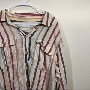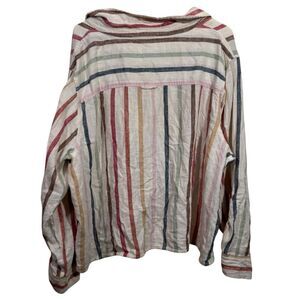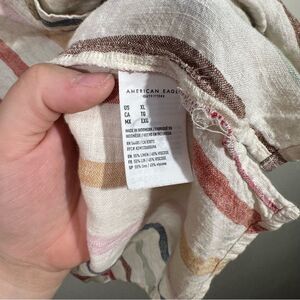 Gently worn women's size xl American eagle pastel striped linen blend button up collared shirt. Relaxed fit, chest pockets, Please review all photos for any signs of wear-pictured as is. Disclaimer: Any items with any wear/staining has not been treated, and unsure of ability to remove/treat condition. Comes from a smoke free home, bundle with other items to save & minimize shipping cost.