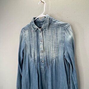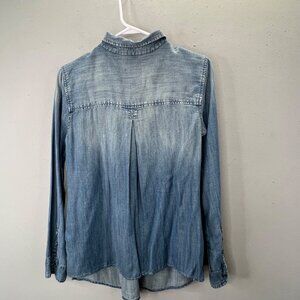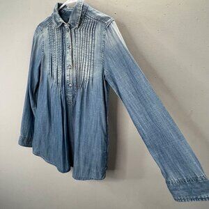 American Eagle popover top with tuck pleating, long sleeves and buttons. Lightweight chambray in blue with pockets. Good condition but the back hem was cut shorter and re-hemmed (see last photo). Size XS.