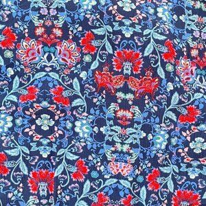 American Eagle Peasant Style Romper Blue and Red Floral Print Elastic Neck with Scoop Split Neckline and Buttons to Waist Bracelet Length Sleeves with Elastic Cuff. Elastic Waist. One Inch Ruffle at Hemline. BOHO