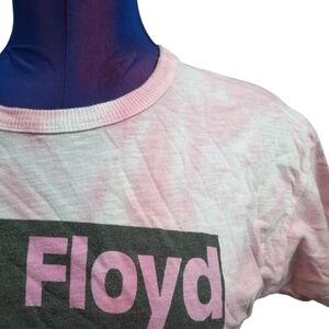 Features crew neck, short sleeve, pink and white tye dye, front and back graphics, Pink Floyd, crop top with roll hem.