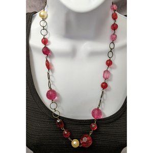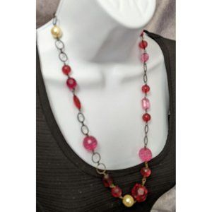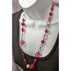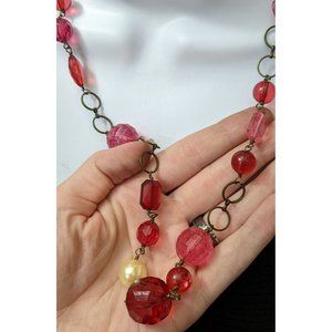 American Eagle pink Valentine statement necklace. It features bronze tone hoops, and bronze tone connectors. It has a random smattering of large faceted acrylic beads in shades of pink and red, with faux pear bead accents. It has a heart jewelry tag with the "ae" American Eagle symbol. This is a great statement necklace for Valentine's Day! It looks great on its own, but can also be stacked with other necklaces. Great for casual wear, and parties!