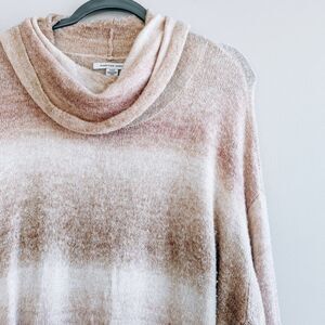 Details: Good gently worn condition, super soft and stretchy material, cozy cowl neckline, oversized fit, stripe pattern, shorter length in front and longer in back, drop shoulder