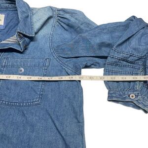 Features and details: pintucked front button area, button closure down front, two chest pockets, factory fading and tinting on shoulder area and bottom hem, puffed shoulder, balloon bishop sleeves with pintuck detail on lower portion, button cuffs, collared, no stretch