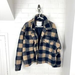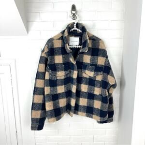 Good pre worn condition. Big check plaid print. Fuzzy Sherpa style material. Zip up jacket. Has a boxy trucker style to it and slightly cropped fit. Size large. Collared neck. Chest pockets. Please note there was a small piece of navy material that was in the tan square during manufacturing. Noted in above photos. All sales final.