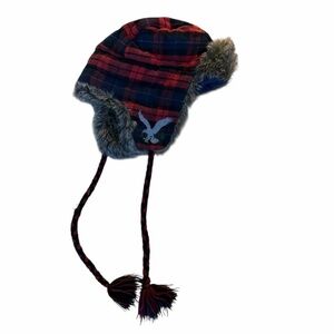 Stay warm and stylish in this cozy American Eagle Outfitters red and navy plaid trapper hat. Designed with soft faux fur ear flaps, braided tassels, and a quilted lining for extra warmth. Perfect for cold weather, skiing, outdoor adventures, or adding a preppy winter touch to your outfit.