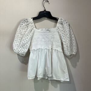 American Eagle Puff Sleeve Babydoll White Eyelet Smocked Blouse Size S