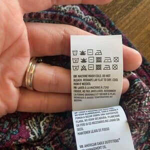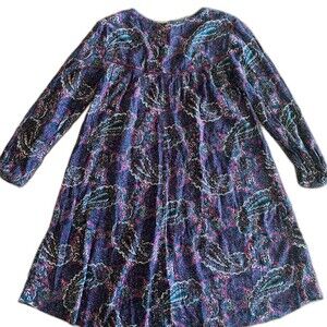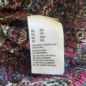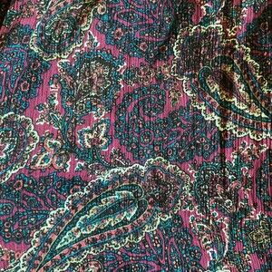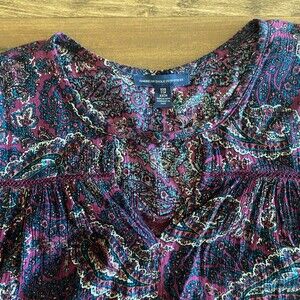 American Eagle dress, women’s XXS, 55% cotton/45% viscose. 3/4 length sleeves with elastic wristband, crewneck with v-shaped cutout & button strap, lace detail across chest, slight high-low curved hem, back lace detail has been repaired from previous tear as pictured, gauze-like texture, plum background with large paisley print in white/brown/black/teal/berry (colors are deeper/darker in person), GUC. Length- front 31”, back 32” Bust-17.5”