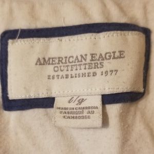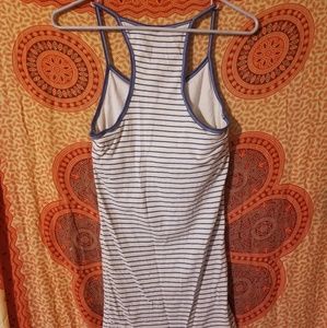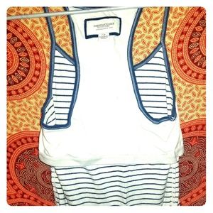 White American Eagle tank top with navy blue stripes. I've only worn it a few times. No stains, holes, or tears. It is a super comfy tank top with a built-in bra for that extra support! Perfect for running to the grocery store, or staying in and binging your favorite shows! If you have any questions, please don't hesitate to contact me!