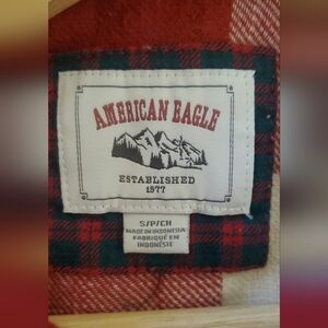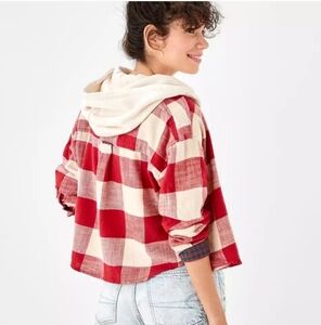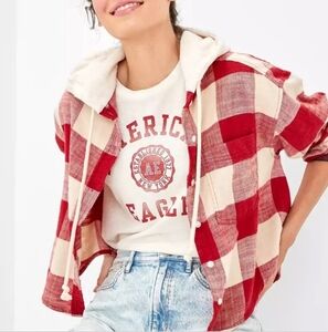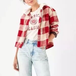 American Eagle Red & Cream Cotton Hooded Plaid Flannel Shirt Shacket Size Small