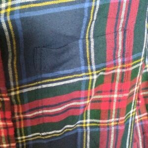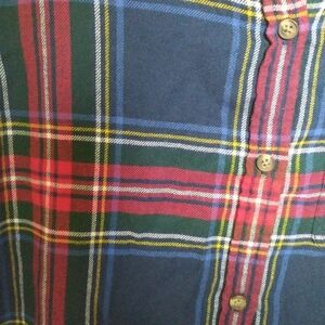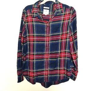 American Eagle Ahhmazingly Soft Red, green, white and Blue Plaid checked Long Sleeve Boyfriend Flannel Button up Shirt with a slight high low hem