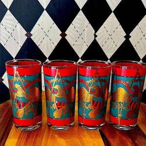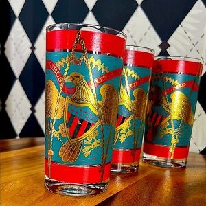 RARE & COLLECTIBLE – Elevate your barware collection with this stunning set of four (4) vintage Cera whiskey glasses featuring gold-plated detailing of the American eagle, shield, and “E Pluribus Unum” banner. The bold sky blue background and shimmering gold accents make these an absolute showstopper!