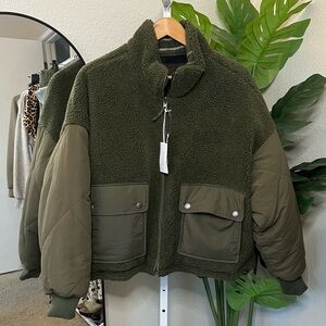 💚 American Eagle Reversible Sherpa Bomber Jacket Sz M | Olive Green Plaid Puffer