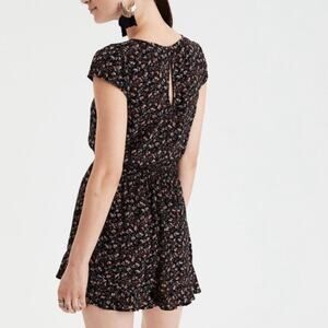 American Eagle romper in women's size medium. Buttons at the front. Elastic waist with decorative tie with tassels. Black floral 100% viscose. Machine washable. Cap sleeves. Two pockets. Button at the back of the neck. There is a small section of the neckline that has come undone at the edge. Please see picture.
