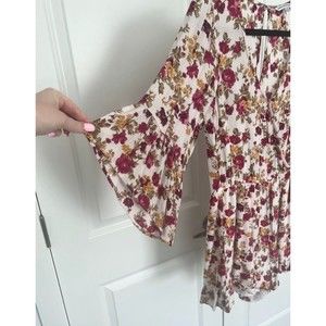 American Eagle Romper Floral Tan Red Pink V Neck Flare Cropped sleeves M Medium