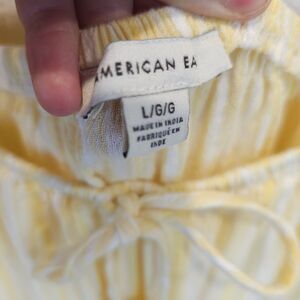 American Eagle Romper Size L Butter Yellow White Striped Off Shoulder Tassels