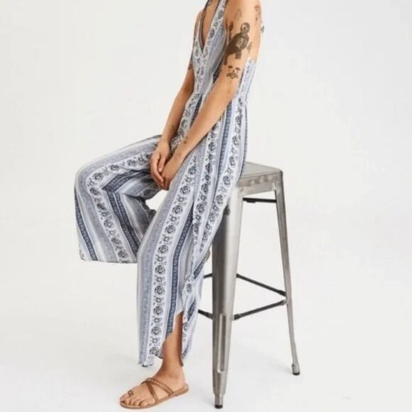 American Eagle Romper Women’s Small Blue White Tie Back Floral Jumper Bohemian