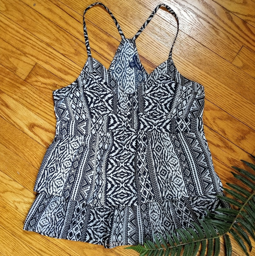 Fresh and flirty racerback tank from American Eagle. Flowy 100% polyester in an awesome black and white tribal print. Features an empire waist with button detail at chest, spaghetti straps, and 2-layer ruffled body. Bottom layer is sheer. Invisible side zipper. Worn once, in excellent condition!