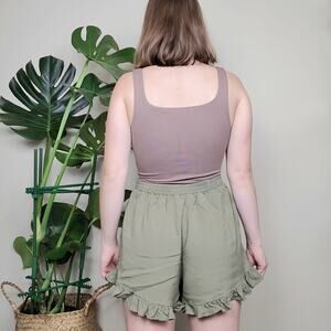 Olive green pull-on style high waisted shorts with flowy ruffled hemline. Drawstring bow tie elasticized waistband. 100% viscose. Earthy minimalist boho bohemian hippie festival cottagecore fairycore goblincore style vibes.
