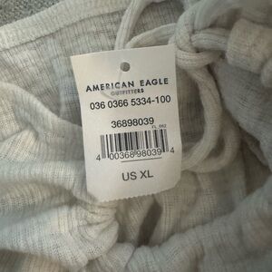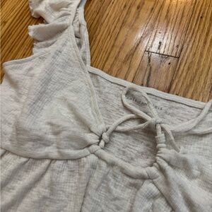 This charming blouse from American Eagle Outfitters features fluttery cap sleeves and a playful tie front. The light gray color and ruffled details add a touch of elegance to its cropped silhouette, making it a perfect match for high-waisted bottoms.